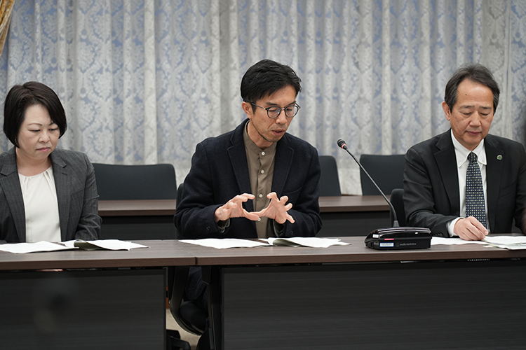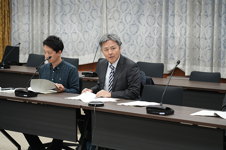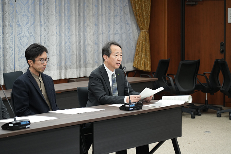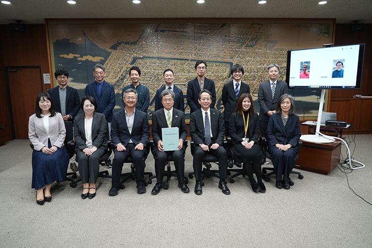 答申提出後には研究会メンバーから概要説明が行われ、学長との意見交換がなされました。学長からは、研究会メンバーの尽力に対する感謝が述べられるとともに、議長・副議長のリードのもと、6つの課題と対応策に整理されたことが高く評価されました。さらに、いただいた提言を大学としてどのように活用していくかは今後の大きな責務であるとし、学内の組織や委員会との連携、自治体や経済界との協力を得ながら、短期的に着手できるものから長期的課題まで段階的に取り組んでいく考えが示されました。