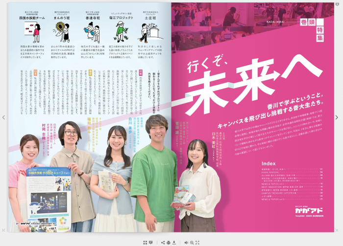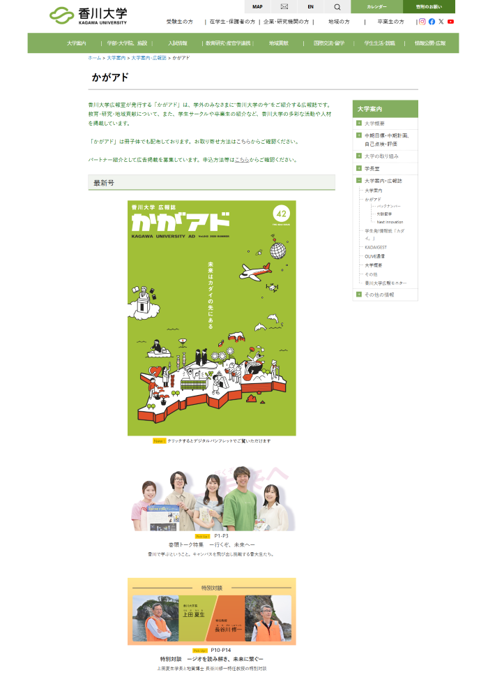 香川大学広報室が発行している「かがアド」は、地域の皆様に、教育・研究・地域貢献のほか、卒業生の紹介など広く紹介する広報誌です。