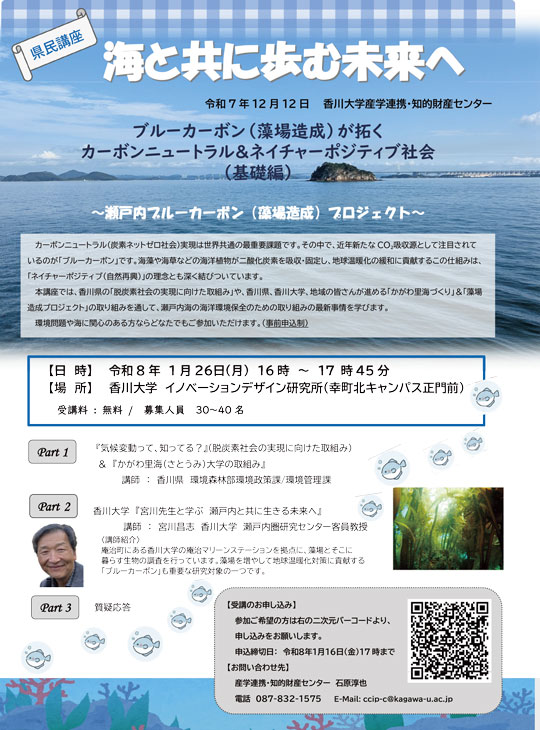 カーボンニュートラル(炭素ネットゼロ社会)実現は世界共通の最重要課題です。その中で、近年新たなCO₂吸収源として注目されているのが「ブルーカーボン」です。海藻や海草などの海洋植物が二酸化炭素を吸収・固定し、地球温暖化の緩和に貢献するこの仕組みは、「ネイチャーポジティブ(自然再興)」の理念とも深く結びついています。 こうした時流を踏まえ、香川大学が「海と共に歩む未来へ」をテーマに以下のとおり県民講座を開催します。 本講座では、香川県の「脱炭素社会の実現に向けた取組み」や、香川県、香川大学、地域の皆さんが進める「かがわ里海づくり」&「藻場造成プロジェクト」の取り組みを通して、瀬戸内海の海洋環境保全のための取り組みの最新事情を学びます。