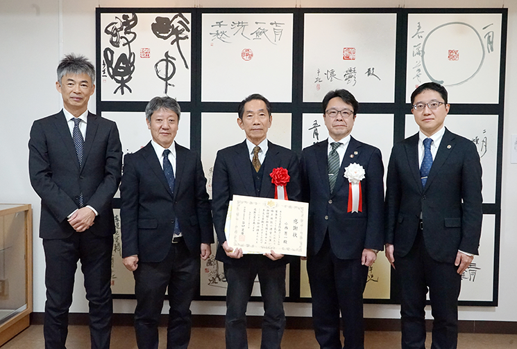 小西教授は、平成27年から約11年間にわたり、法務省高松矯正管区(令和7年4月1日より四国矯正管区)内矯正施設の受刑者や少年院在院者の文芸作品コンクール(書道部門)の審査員を長く務め、その功績に対し、このたび感謝状と記念品が贈呈されました。