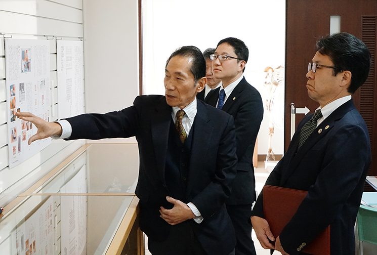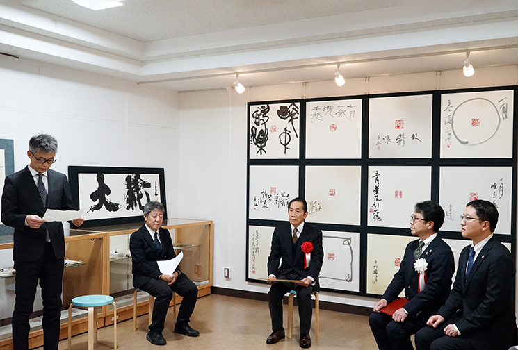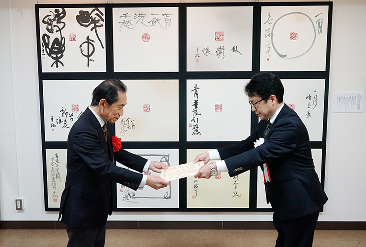 香川大学博物館で開催中の特別展「小西憲一(斗虹〈とこう〉)篆刻展」(会期:11月3日(月・祝)〜12月20日(土))の会場にて、令和7年12月10日(水)に法務省四国矯正管区長の谷口晃康氏から小西憲一教育学部教授への感謝状及び記念品贈呈式が執り行われました。