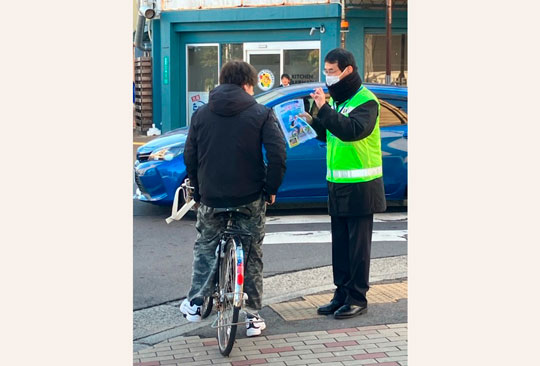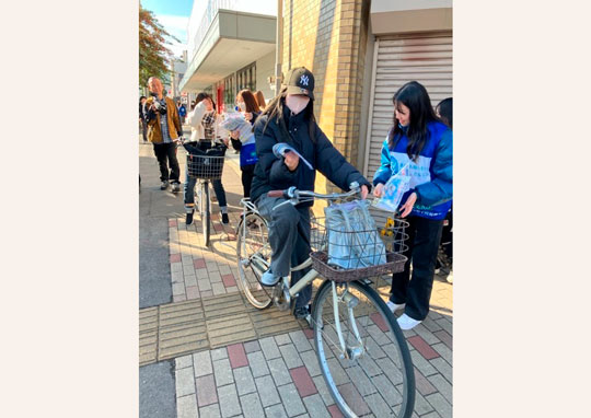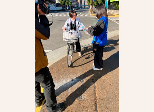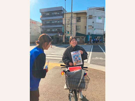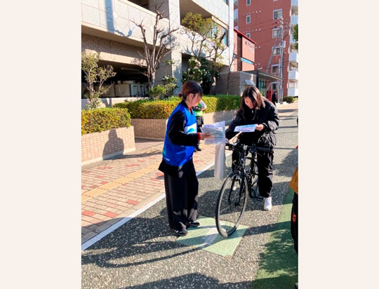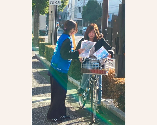 チラシの配布にあたり、高松市、高松北署、あいおいニッセイ同和損害保険㈱の社員とともにデザインを考案した学生もチラシ配布に参加し、通行する方々へ自転車の乗車方法について案内をするとともに自転車事故の削減に向けた啓発を行いました。