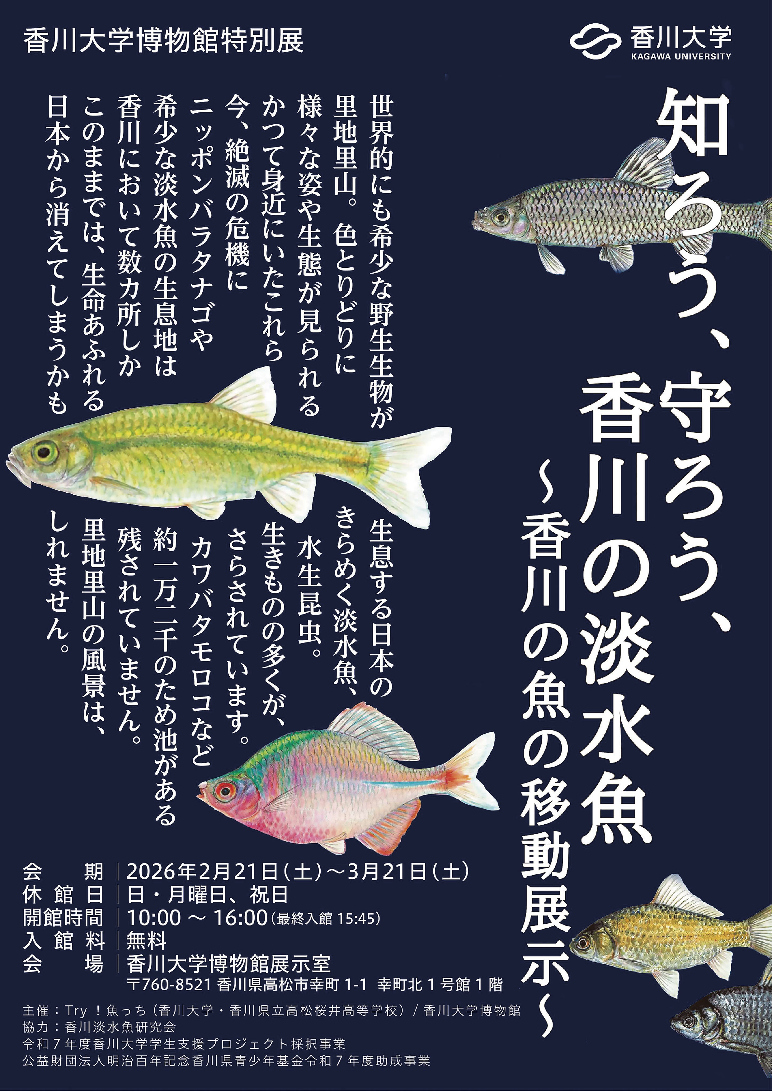 香川大学博物館では、香川大学の学生および香川県立高松桜井高等学校の生徒によるプロジェクト「Try! 魚っち(とらい!うおっち)」の企画による特別展「知ろう、守ろう、香川の淡水魚~香川の魚の移動展示~」を2026年2月21日(土)から3月21日(土)までの会期で、当館展示室にて開催します。