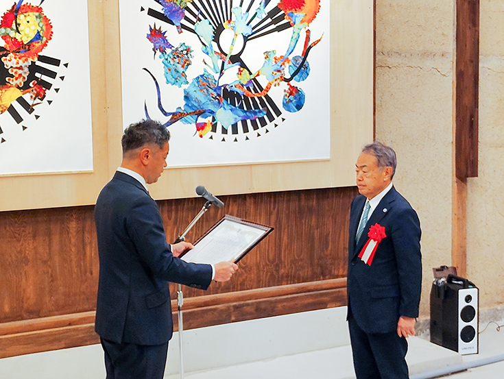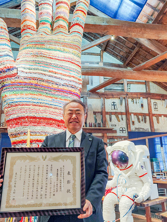 3月7日(土)、東かがわ市より「東かがわ市未来アワード 地域活性化・地域貢献部門」を受賞し、上村一郎市長より表彰状をいただきました。受賞した「東京藝術大学×香川大学ぐんだらけ」プロジェクトを代表し、当日は、筧善行イノベーションデザイン研究所長が表彰式に出席しました。