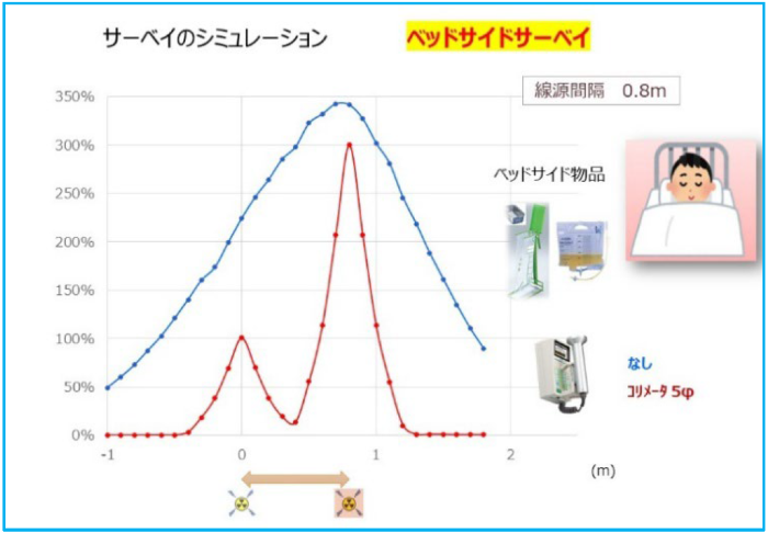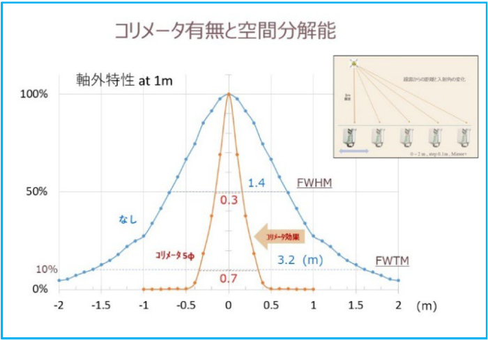 コリメータ装着により指向性が大幅に高まり、目的方向以外の放射線をカットする事が可能で、従来困難だったベッドサイドにおける脱落線源のサーベイが対応可能になります。