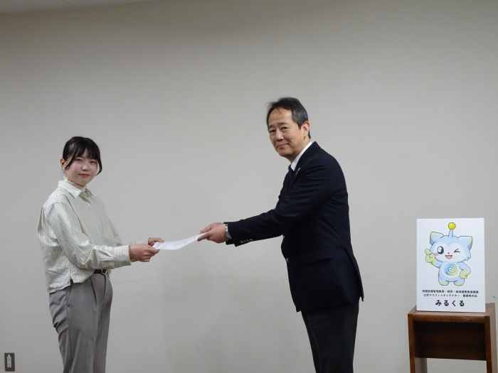 表彰式は、3月30日(月)に実施され、危機管理機構の秋光和也機構長から、最優秀作品賞受賞者に表彰状及び記念品が授与されました。併せて、選考理由の説明、受賞者からのコメントがありました。