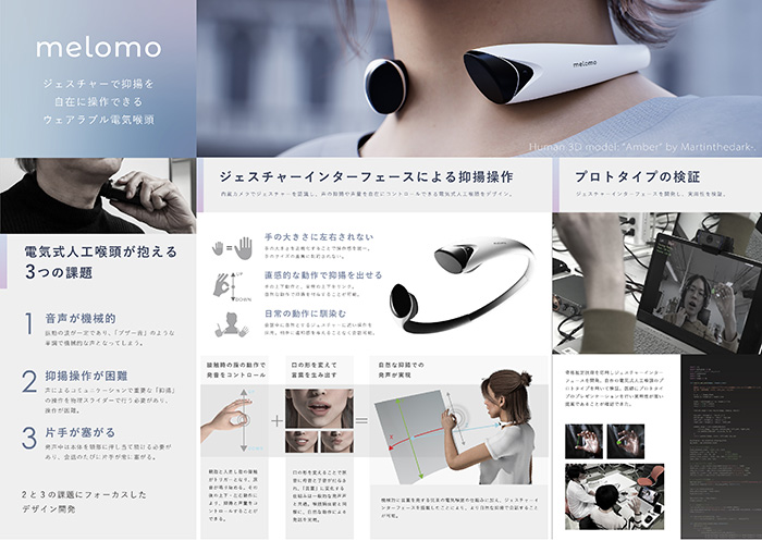 悪性腫瘍により声帯を摘出し、生涯声を出せなくなった患者が代替発声手段として使用する電気式人工喉頭には、「抑揚操作が困難」「市販品のほとんどは使用時に片手が塞がる」などの課題があった。本提案では、ジェスチャーインターフェースにより自然な動作で声に抑揚を付加できる新たな電気式人工喉頭のデザイン開発を行った。