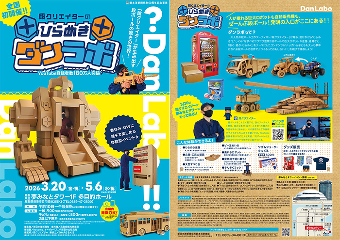 「ひらめきダンラボ」は、謎の段ボール工作アーティスト「段クリエイター」による体験型展示イベントで、巨大ロボットや迷路、遊具など、すべて段ボールで作られた作品を通して「動く・遊ぶ・ひらめく」を体験できる空間です。子どもから大人まで楽しみながら、ものづくりの仕組みや発想の面白さを体感できる内容となっています。