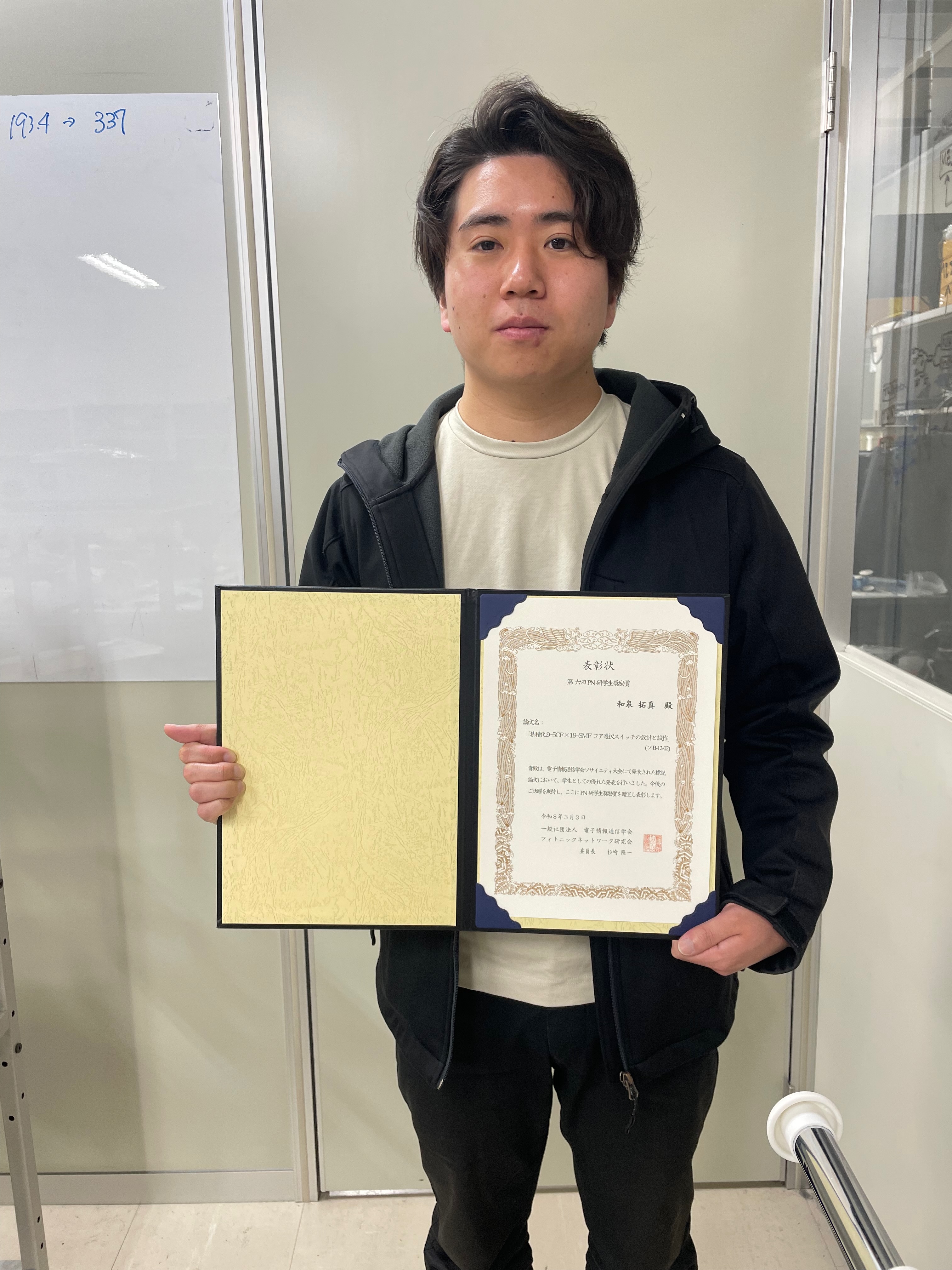 概要: 本賞は、電子情報通信学会 総合大会およびソサイエティ大会における フォトニックネットワークセッションにおいて優れた講演を行った学生に対して授与されます。講演タイトルは「集積化9-5CF×19-SMFコア選択スイッチの設計と試作」(2025年9月電子情報通信学会 ソサイエティ大会)です。