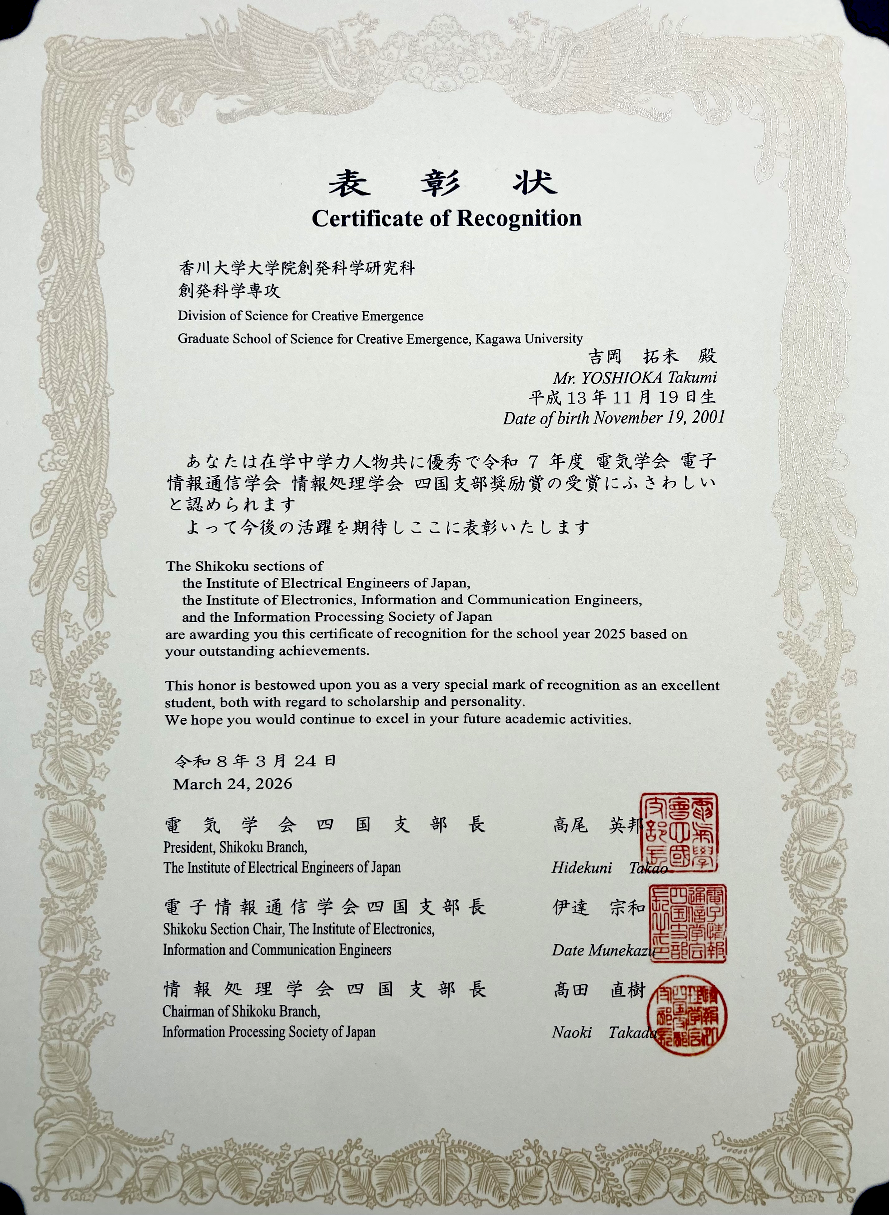 受賞名:令和7年度電気学会・電子情報通信学会・情報処理学会四国支部奨励賞