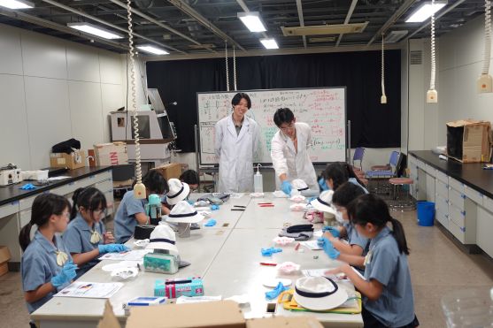体験学習では、防災・危機管理コースの「地震がおきたときにどう行動したらよいか考えてみよう」、人工知能・通信ネットワークコースの「回路を作ってみよう」、機械システムコースの「ロボットを動かす基礎を学ぼう」、材料物質科学コースの「暗やみで光る蛍光インクを作ろう」の4つのテーマのうち、小学生自身が受講したいテーマごとに分かれ、創造工学部での授業を体験しました。
