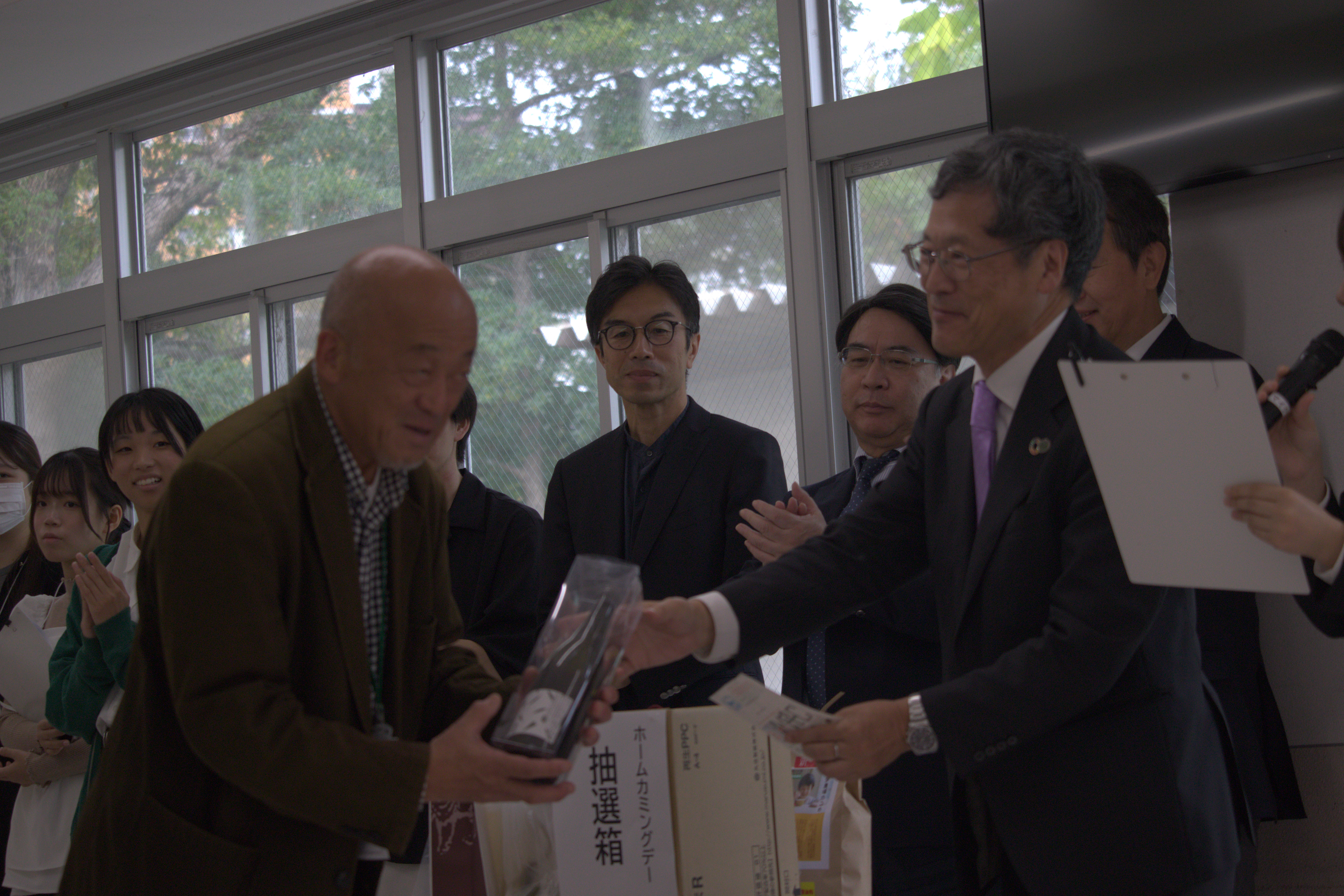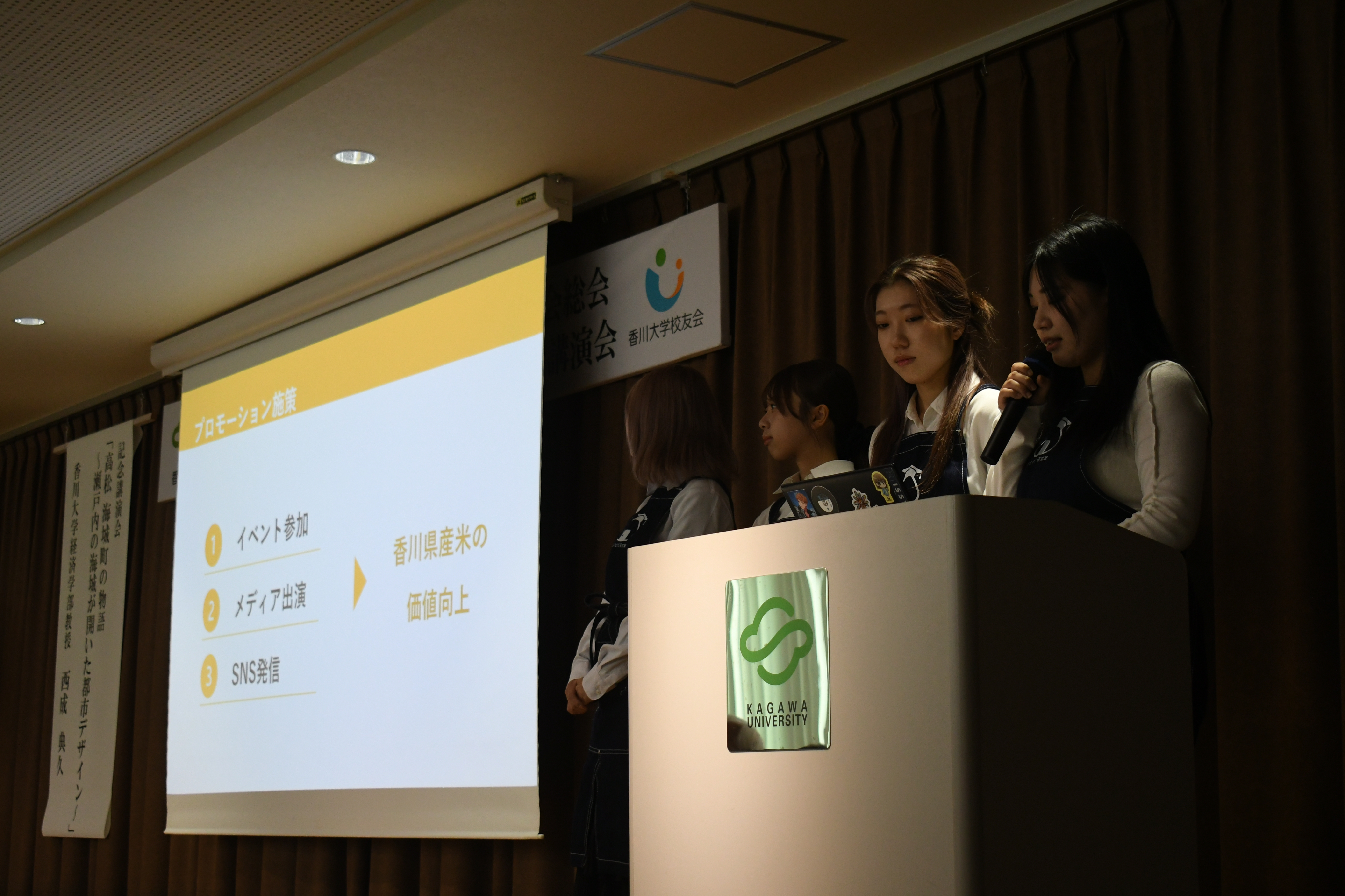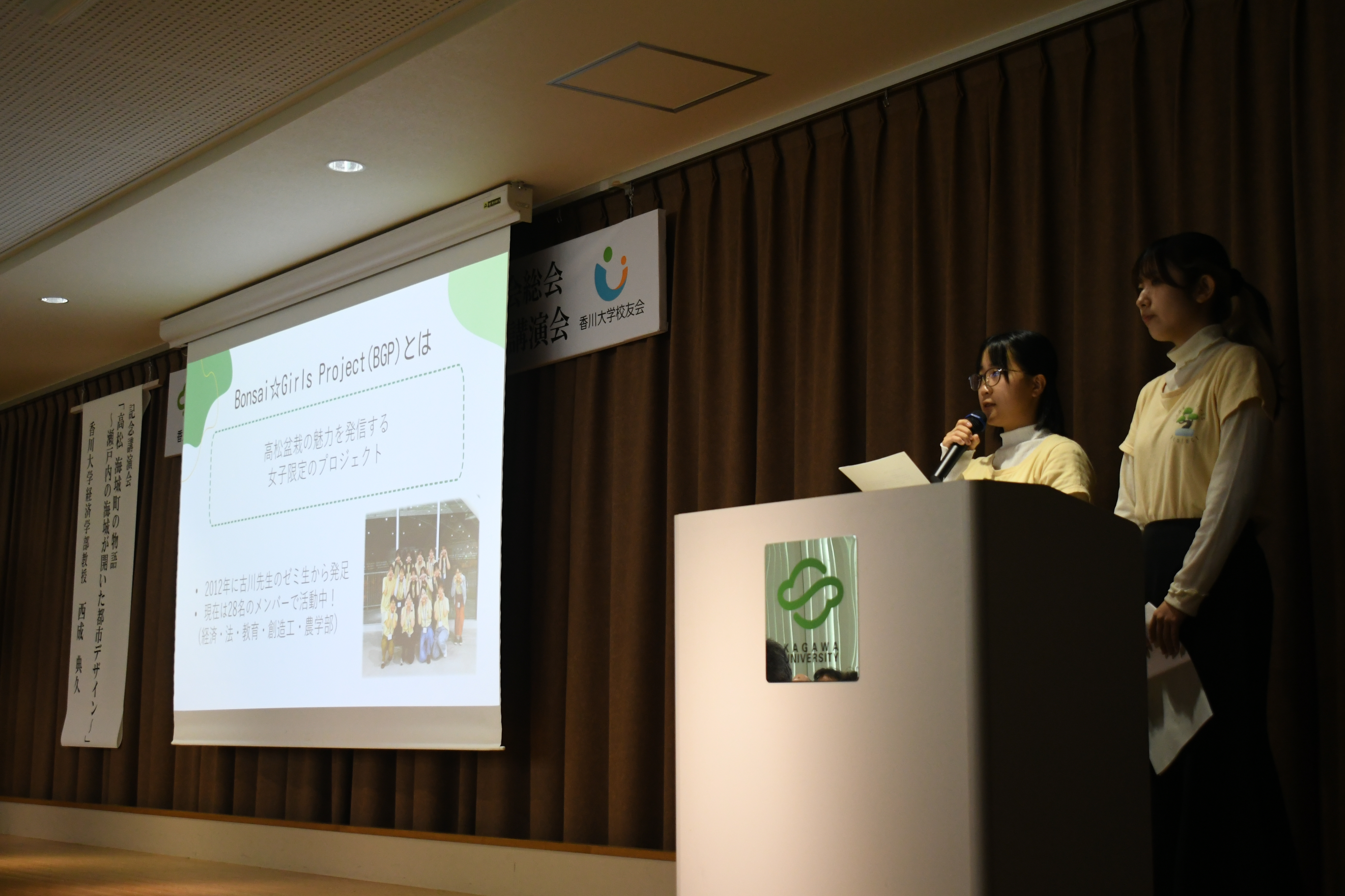 学生の活動報告では、高松盆栽の歴史を守り、認知度向上と普及活動を続けている、Bonsai Girls Projectによる報告、「うどん出汁ジュレおにぎり」が大阪・関西万博会場で期間限定販売され、マスコミにも大きく取り上げられた「おむすび研究室」による活動が報告され、地域に根ざした大学として学生が積極的に取り組む様子に参加者から温 かい拍手が送られました。