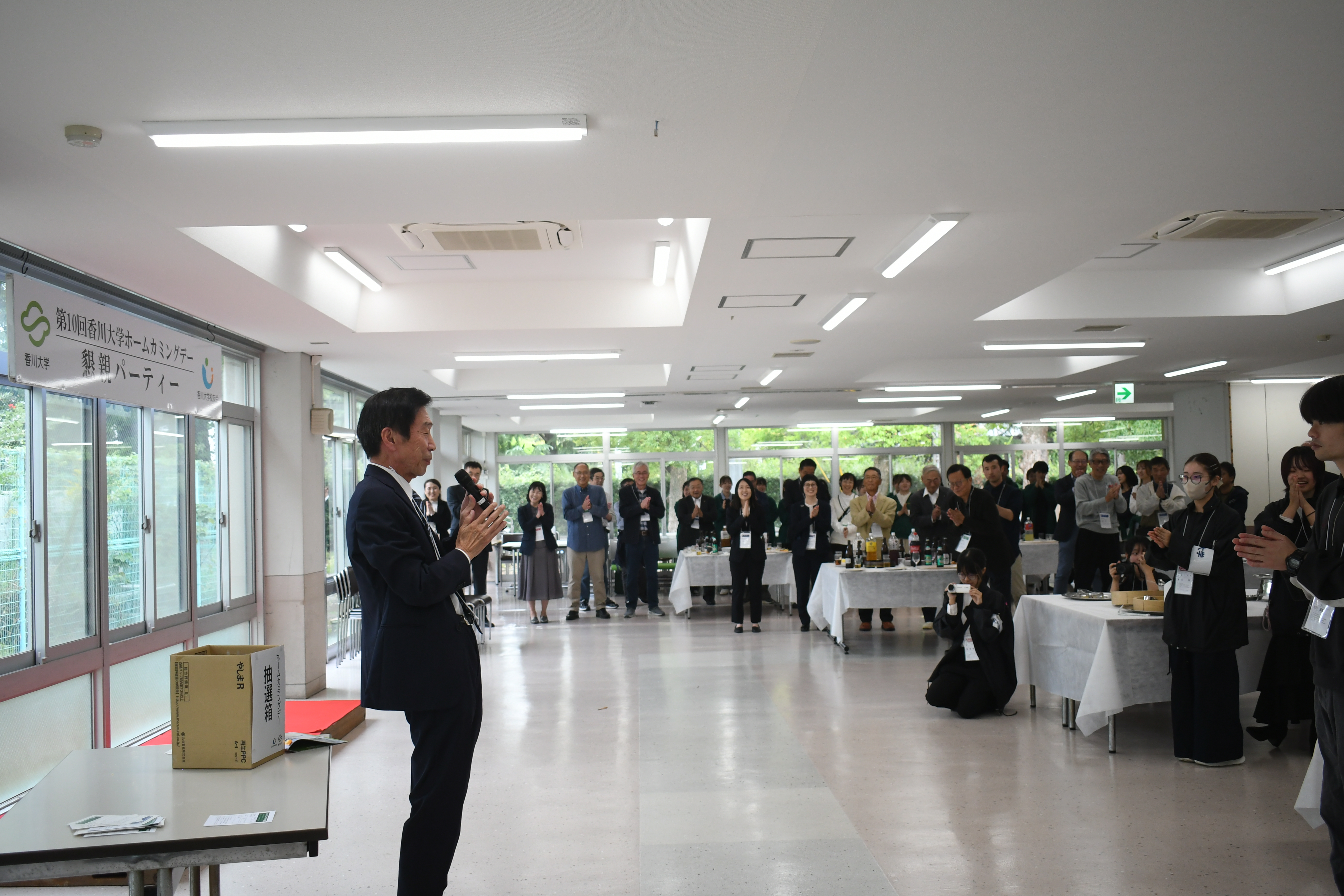 ホームカミングデーは、大学祭期間中の10月25日(土)に開催され、歓迎式典、大学の紹介、学生の活動報告、西成経済学部教授による記念講演、午後からは懇親パーティ、キャンパスツアーを実施しました。当日は約120名の卒業生、元教職員が母校に帰ってこられました。
