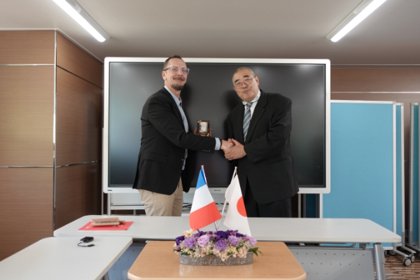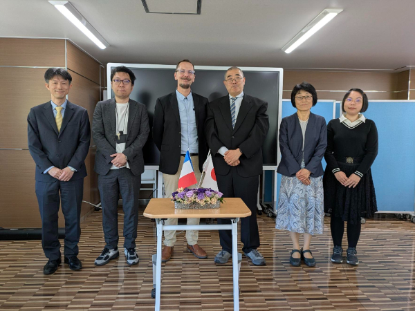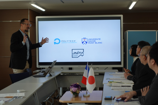 表敬訪問では、寺尾インターナショナル副オフィス長の歓迎挨拶に続き、Christophe LAMBERT氏より同校の工学教育の特徴やカリキュラム、国際交流の取り組みについて紹介がありました。本学の岡﨑慎一郎教授(創造工学部)も同席し、活発な質問や意見交換が行われました。