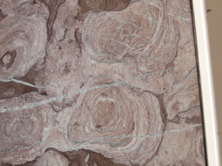 ストロマトライトとは、シアノバクテリア(ラン藻類)のつくる構造で、ドーム状や半円形、棒状などの形をしています。コレニア(コレニア石灰岩)とはストロマトライトの一種で、中国産の石材で見事な成長構造を観察できます。