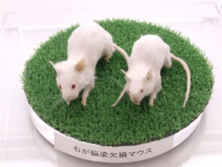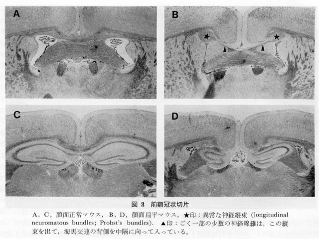 脳梁欠損マウスの発見 香川医科大学(現香川大学医学部)で飼育されていたddN系マウスは、1972年に藤井医動物・神戸から購入し、当時厚生省(現厚生労働省)神経疾患委託研究「精神遅滞の本態および成因に関する開発的研究」(分担代表研究者:村上哲英)というテーマの下、回避学習用の実験動物として開発が続けられていた。1982年にddNマウス近交系化が試みられた際にはじめて、顔面が扁平したマウスが発見され、出生する第2世代胎児のうち10%の割合で顔面が扁平なマウスがの出現を確認できた。このころ、外観を制御する遺伝資源の保存として調査研究が開始された。1984年頃、顔面扁平マウスは実験に供与できる数に達し、外鼻短小、上顎・下顎骨形成不全、眼間拡大などを有していることが明確になった。一方、回避学習の成績では顔面正常と扁平マウスとの間に差は認められなかったことから、脳の組織学的解析が行われた。その結果、ようやく、顔面扁平マウスは、脳梁を完全に欠損している事が示された。これらの結果は、Ozaki H et al., Neuroscience Res. (1) 81-87, 1984に発表され、昭和58年度研究成果報告書として厚生省へ報告された。下図は、研究成果報告書を引用させていただいた。