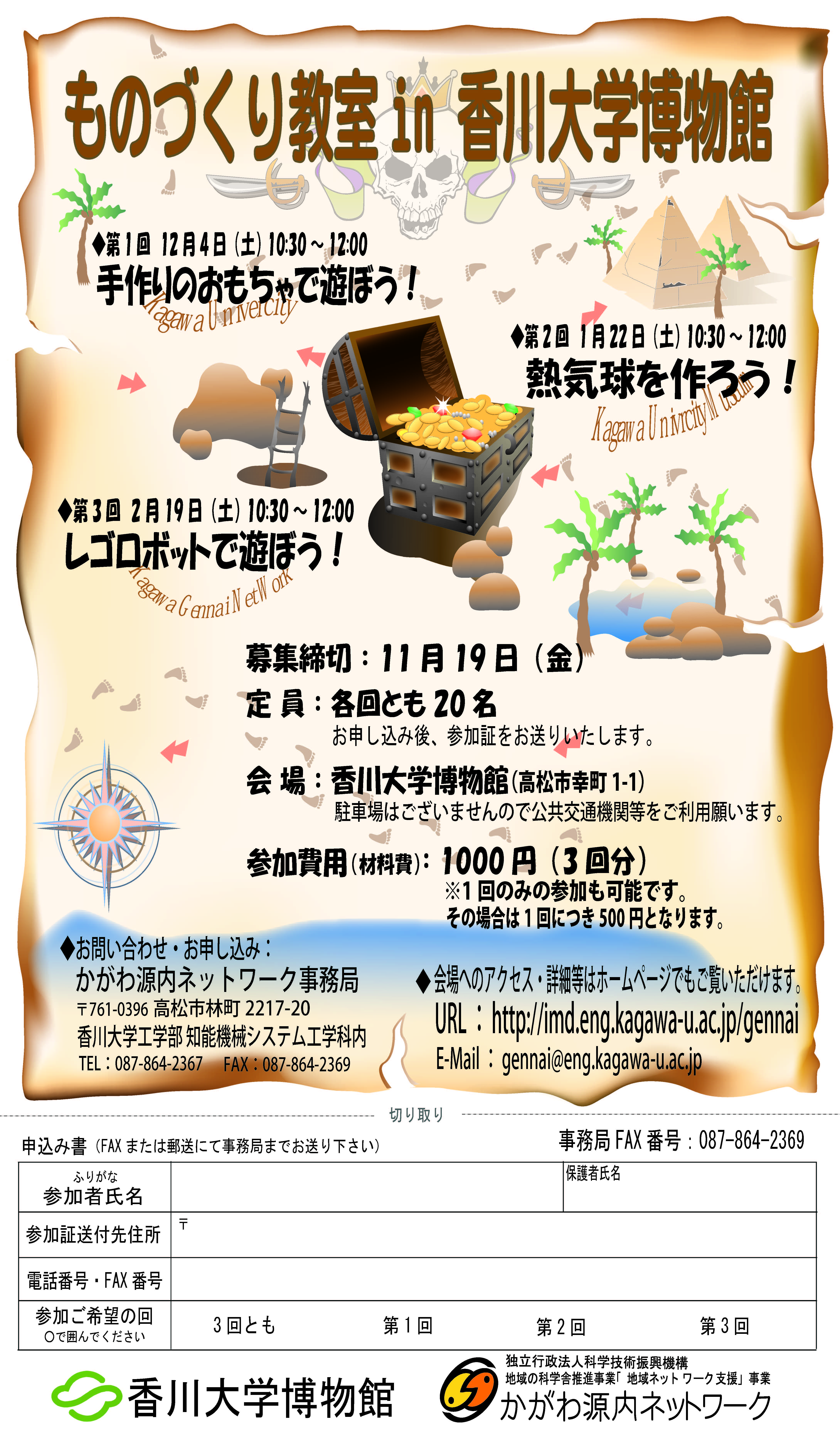 ◆第1回 2010年12月4日(土)10:30~12:00「手作りのおもちゃで遊ぼう!」参加者:37名◆第2回 2011年1月22日(土) 10:30~12:00「熱気球を作ろう!」参加者:43名◆第3回 2011年2月19日(土) 10:30~12:00「レゴロボットで遊ぼう!」参加者:31名◎募集締切:2010年11月19日(金)◎定員:各回とも20名※お申し込み後、事務局より参加証が送付されます。◎会場:香川大学博物館※駐車場はございませんので、公共交通機関等をご利用ください。◎参加費用(材料費):1000円(3回分)※1回のみの参加も可能です。その場合は1回につき500円となります。◎お申し込み方法チラシの下部分にある申込書にご記入の上、事務局まで郵送またはFAXにてお申し込みください。◎お問い合わせかがわ源内ネットワーク事務局〒761-0396 高松市林町2217-20香川大学工学部 知能機械システム工学科内TEL:087-864-2367(月~金曜日 9:00~16:00) FAX:087-864-2369URL:http://imd.eng.kagawa-u.ac.jp/gennai/E-Mail:gennai@eng.kagawa-u.ac.jp
