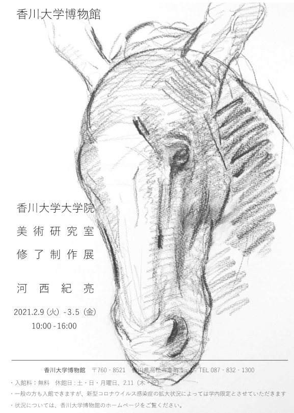 本展は、本学大学院教育学研究科 教科教育専攻芸術・スポーツ系教育コース美術分野 河西紀亮さんの修了制作展です。修了制作作品を含む油彩作品6点とその制作に関してのクロッキー。さらに、ご自身の修士論文やスライド動画など河西さんが本学で学び研究した業績を展示し、学内外に広く公開しました。
