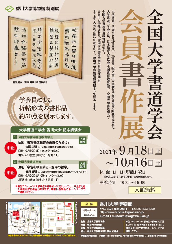 大学書道三学会が9月19日(日)・20日(月・祝)に香川大学教育学部を会場に開催しました。大学書道三学会とは、日本教育大学協会 全国書道教育部門・全国大学書道学会・全国大学書写書道教育学会です。会期中に併催される「全国大学書道学会会員書作展」をより多くの方にご覧いただきたく、香川大学博物館特別展として展示しました。