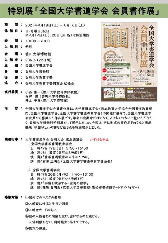 主催:全国大学書道学会共催:香川大学博物館後援:香川大学教育学部協力:香川大学教育学部同窓会 松楠会特別展実行委員会:小西憲一(香川大学教育学部)、寺林優(香川大学博物館長)、井上幸恵(香川大学博物館)