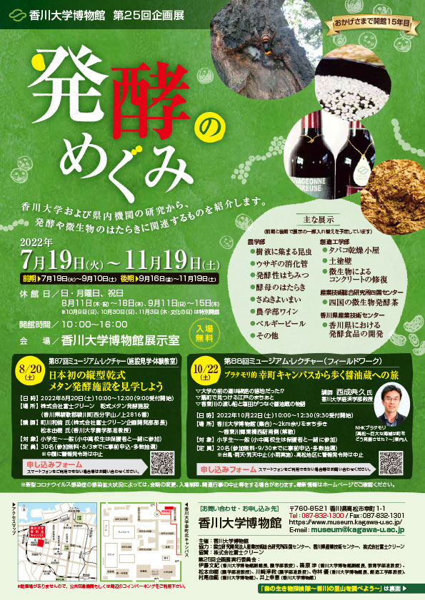 香川大学および県内機関の研究から、発酵や微生物のはたらきに関連するものを紹介。発酵というと酒・醤油・味噌・納豆などの発酵食品が思い浮かぶが、発酵や微生物のはたらきは、発酵食品に限らず、樹液に昆虫が集まるメカニズムやウサギの消化菅のしくみなどにも関与。さらに、たばこの加工過程、昔ながらの土壁の製造、微生物によるコンクリートの修復などの建築分野にも関係する。産業技術総合研究所四国センターでの微生物発酵茶の研究、香川県産業技術センターでの発酵食品の開発なども照会