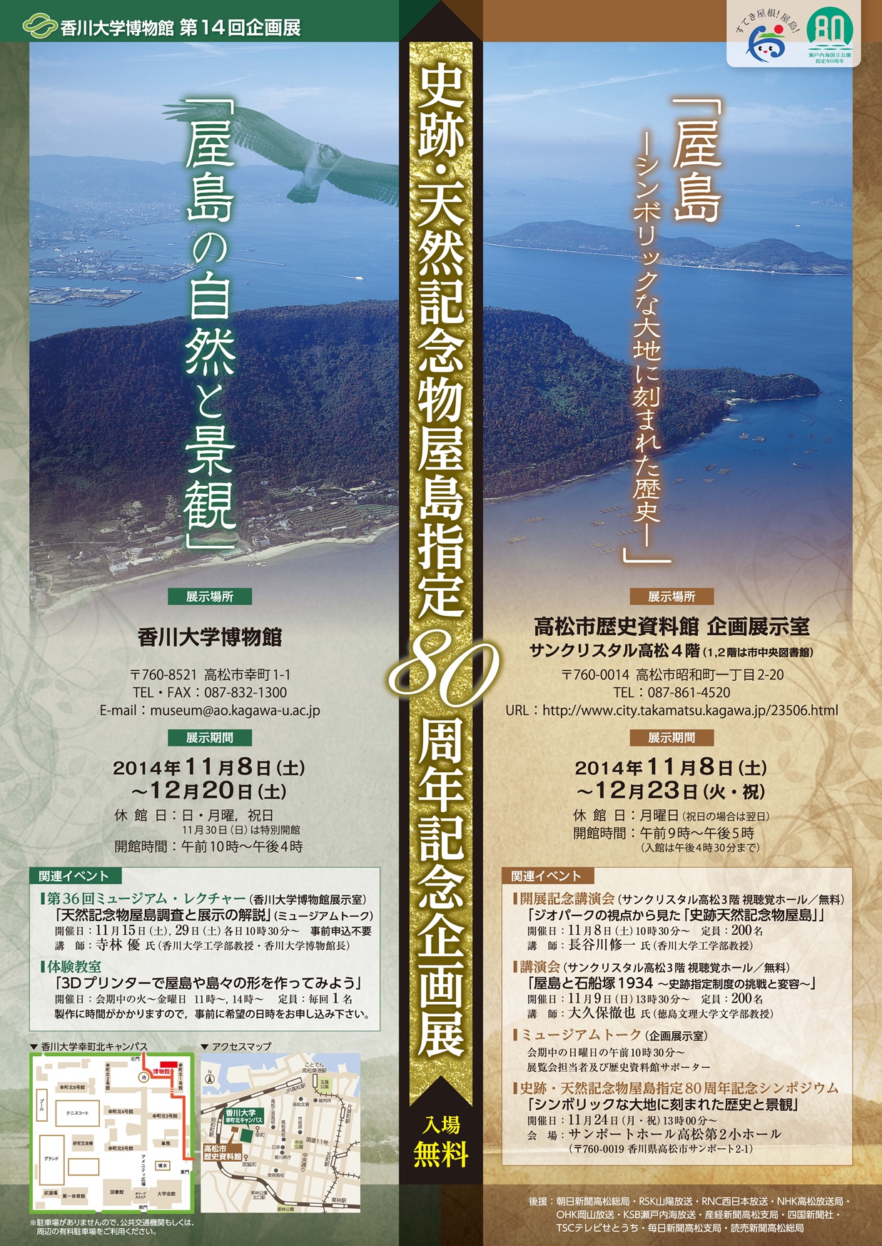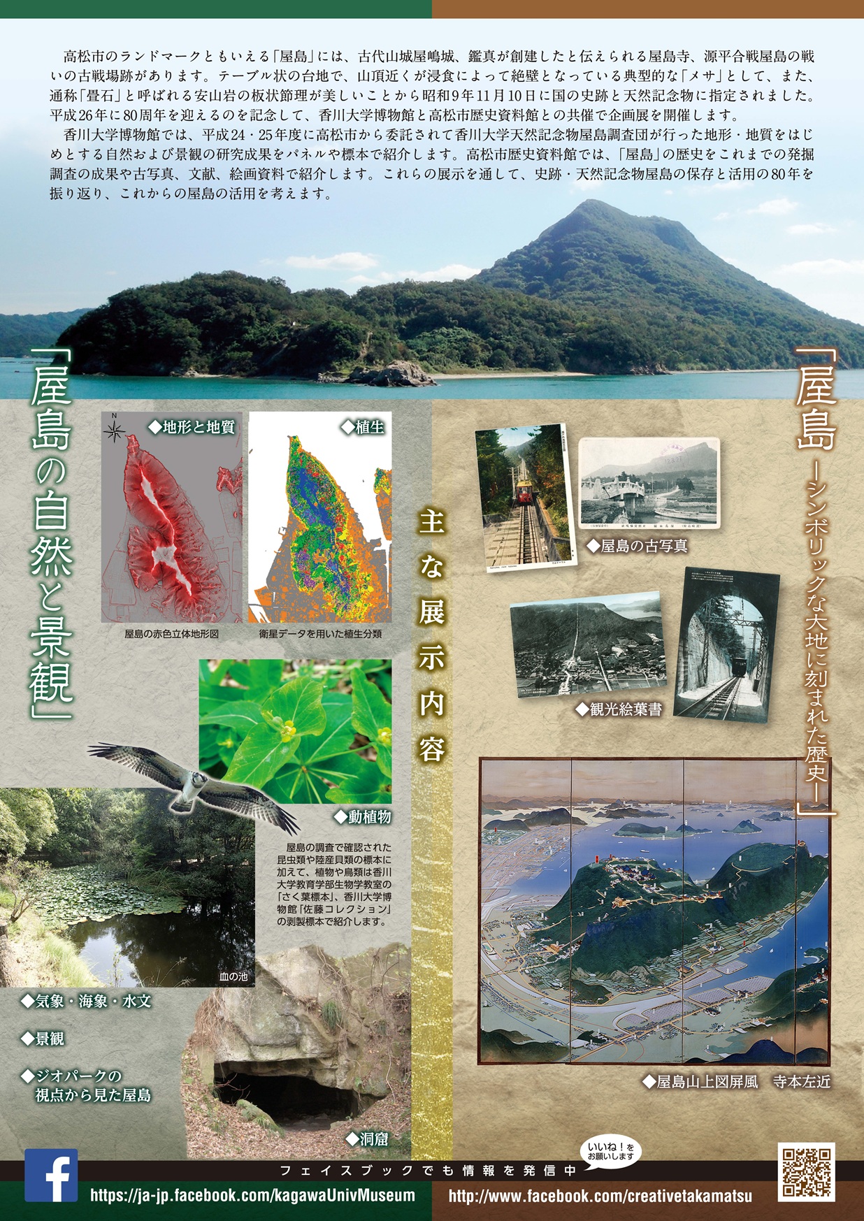 昭和9 年11 月10 日に国の史跡と天然記念物に指定され、平成26 年に80 周年を迎えた「屋島」をテーマに、高松市歴史資料館の企画展「屋島―シンボリックな大地に刻まれた歴史―」と共同で企画展を開催。香川大学博物館では、平成24・25 年度に高松市から委託されて香川大学天然記念物屋島調査団が行った地形・地質をはじめとする自然および景観の調査研究の成果をパネル、写真や図表、標本資料等で紹介。