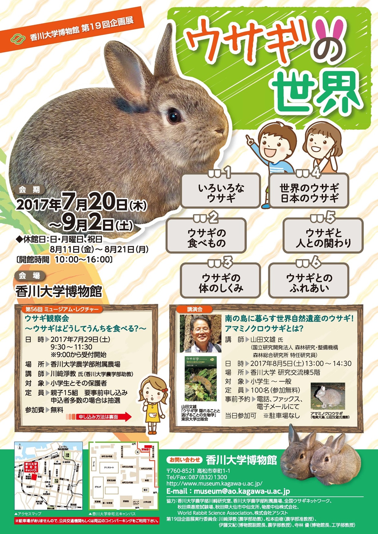 ウサギは昔話や童話などによく登場し、ペットとしても人気があり、モチーフのグッズも多く、なじみ深い動物といえます。しかし、ウサギといってもいろいろな種類あり、なじみのあるウサギはごく一部にしかすぎません。ウサギの生態は意外と知られていません。「いろいろなウサギ」「世界のウサギと日本のウサギ」「ウサギの食べもの」「ウサギと人との関わり」「ウサギの体の仕組み」「ウサギとのふれあい」について、ウサギの仲間や天敵のはく製、エサの見本、腸の模型、ウサギ飼育法の古書、さらにウサギの生体を展示