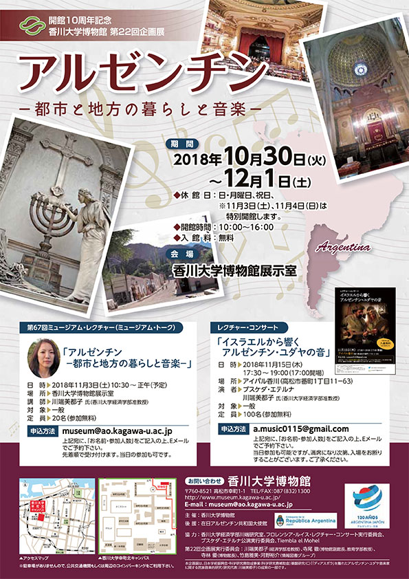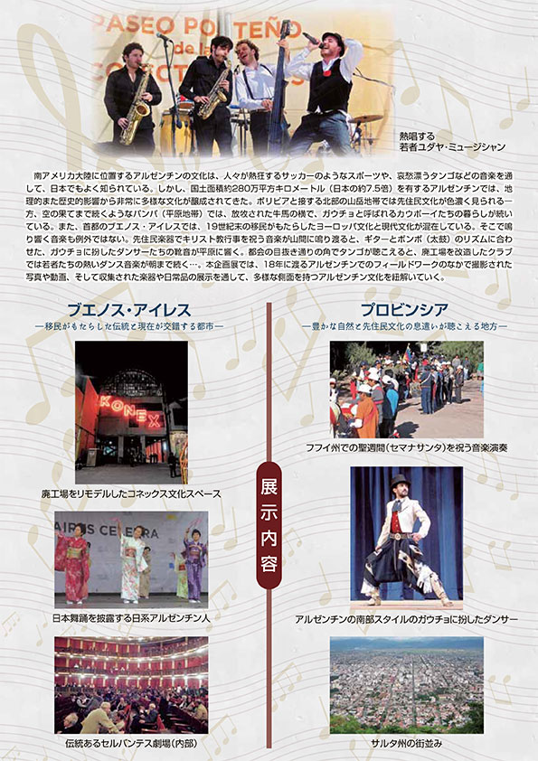 アルゼンチンでは、地理的また歴史的影響から非常に多様な文化が醸成。北部の山岳地帯では先住民文化が色濃く見られる一方、空の果てまで続くようなパンパ(平原地帯)では放牧された牛馬の横で、ガウチョと呼ばれるカウボーイたちの暮らしが続く。首都のブエノス・アイレスでは、19 世紀末の移民がもたらしたヨーロッパ文化と現代文化が混在。香川大学経済学部准教授川端美都子氏による、18 年に渡るアルゼンチンでのフィールドワークで撮影された写真や動画、そして収集された楽器や日常品の展示を通し、多様な側面を持つアルゼンチン文化を紐解く