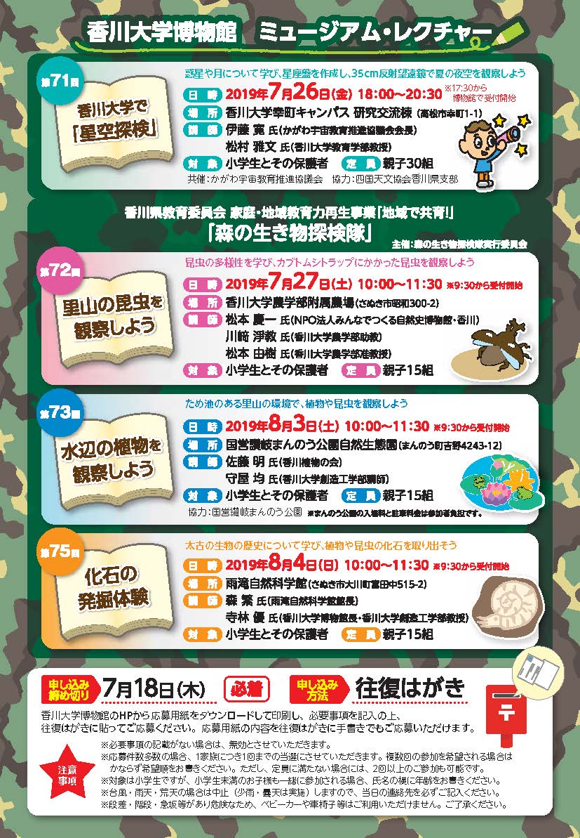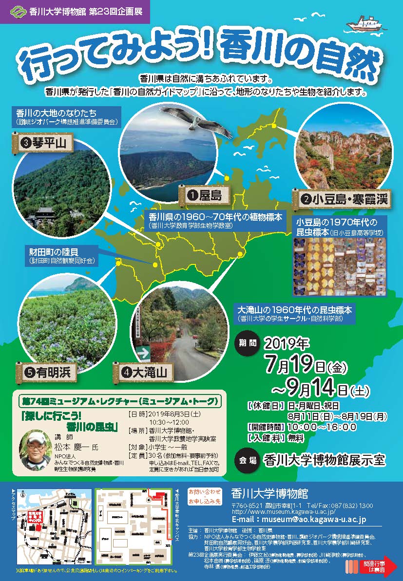 香川県は自然に満ちあふれている。香川県が発行した「香川の自然ガイドマップ」に沿って、「屋島」「小豆島・寒霞渓」「琴平山」「大滝山」「有明浜」の地形のなりたちや生物を標本とともに紹介。さらに、香川の大地のなりたち(讃岐ジオパ-ク構想推進準備委員会)、香川県の1960 ~ 70年代の植物標本(香川大学教育学部生物学教室)、小豆島1970 年代の昆虫標本(旧香川県立小豆島高等学校)、大滝山の1960 年代の昆虫標本(香川大学学生サ-クル・自然科学部)、財田町の陸貝(財田町自然観察同好会)を展示