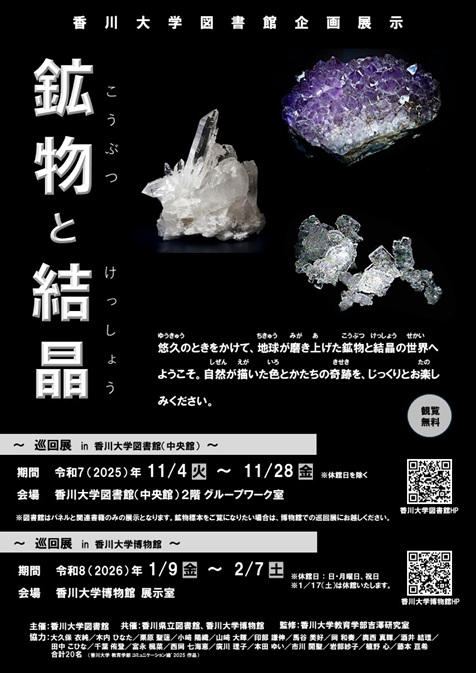 香川大学教育学部の吉澤樹理准教授(生活科教育、理科教育、サイエンスコミュニケーション)が監修した香川大学図書館企画展示「鉱物と結晶」の巡回展を開催します。 同企画展示は、香川大学図書館が主催し、香川県立図書館と香川大学博物館の共催で、2025年9月2日(火)から9月28日(日)までの会期で、香川県立図書館1階閲覧室展示コーナーで開催され、多数の来館者がありました。今回、香川県立図書館、香川大学図書館(中央館)に引き続いての巡回展です。 鉱物とは天然に産する無機物の結晶です。鉱物の種は、化学組成と結晶構造によって分けられ、5000種以上が知られていますが、毎年数十種ほどの新鉱物が見つかっています。鉱物と結晶について、「鉱物とは」、「成り立ち」、「鉱物の名」、「分類方法」、「鉱物の硬度 」、「条痕と比重」、「結晶構造」、「結晶の形」、「ならび方」、「氷は鉱物」の順で紹介します。
