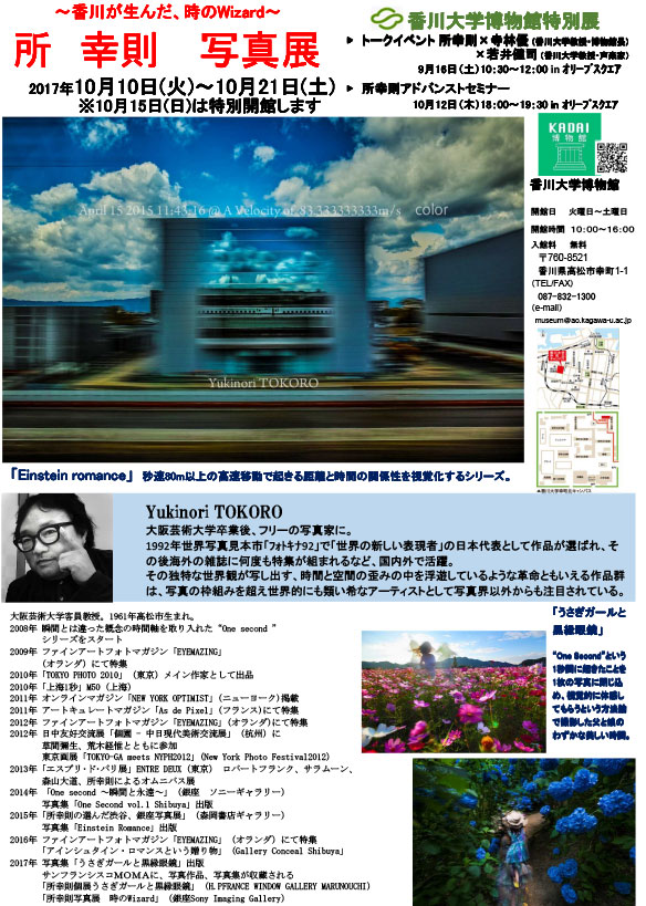 1992年世界写真見本市「フォトキナ92」で「世界の新しい表現者」の日本代表として作品が選ばれ、その後、海外の雑誌に何度も特集が組まれるなど国内外で活躍している高松市出身の写真家所幸則氏の写真を展示します。独特の世界観が写し出す時間と空間の歪みの中を浮遊しているような作品は、写真の枠組みを超え世界的にも類い稀なアーティストとして写真界以外からも注目されています。所幸則氏の初期から最新作までの世界を一貫して見通すことが出来る展示です。