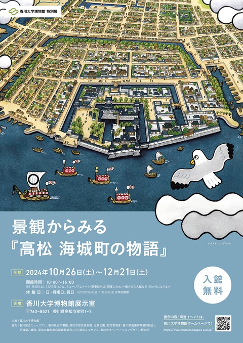 瀬戸内海に面する香川の県庁所在地・高松、かつてこの地には日本を代表する特別な海城がありました。近世期に築かれた海城のなかでも、最初期で最大規模をほこる高松城、そしてその城とともに発展してきた城下町。現代、そして未来の香川・高松を考えるうえで見過ごすことができない「まちの記憶」。本展では「景観からみる『高松 海城町の物語』」と題して、私たちが失いかけている「まちの記憶」を見直し、まちの形成史から香川・高松のシビックプライド醸成を目指します。