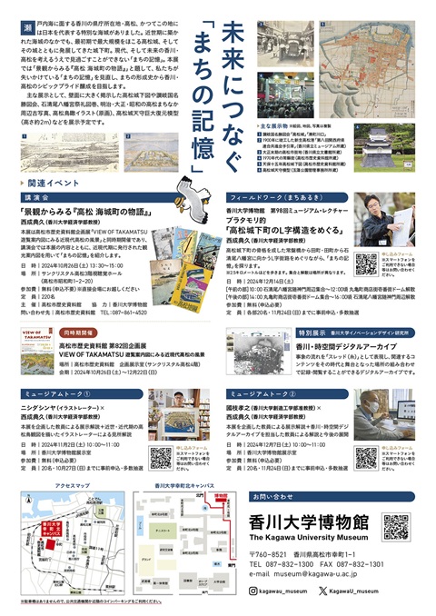 特別展は、今年3月に出版された「高松 海城町の物語〜瀬戸内海の海城が開いた都市デザイン〜」の著者である経済学部の西成典久教授監修のもと、壁面に大きく掲示した高松城下図、讃岐国名勝図会、石清尾八幡宮祭礼図巻、明治・大正・昭和の高松まちなか周辺古写真(いずれも複製)、高松鳥瞰イラスト(原画)、高松城天守巨大復元模型(高さ約2m)などを展示しました。